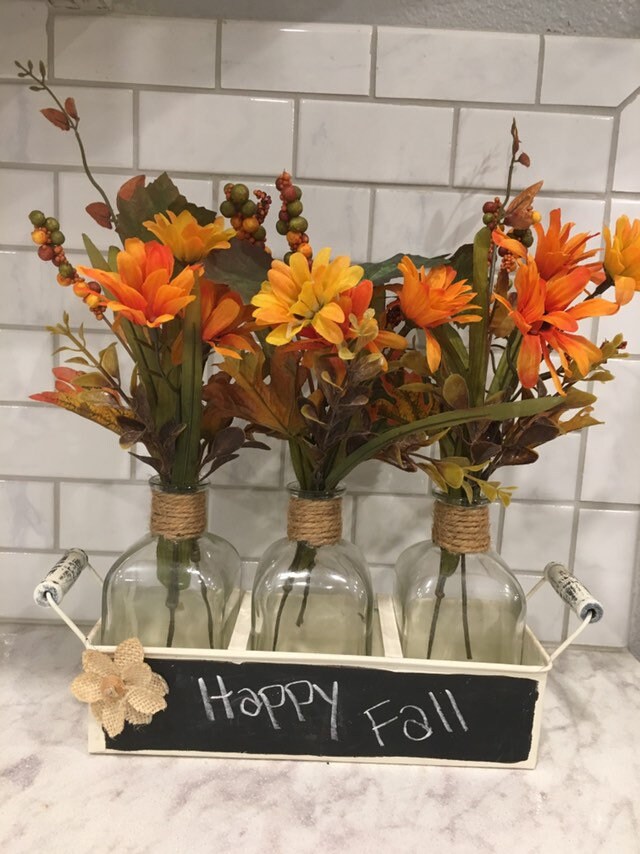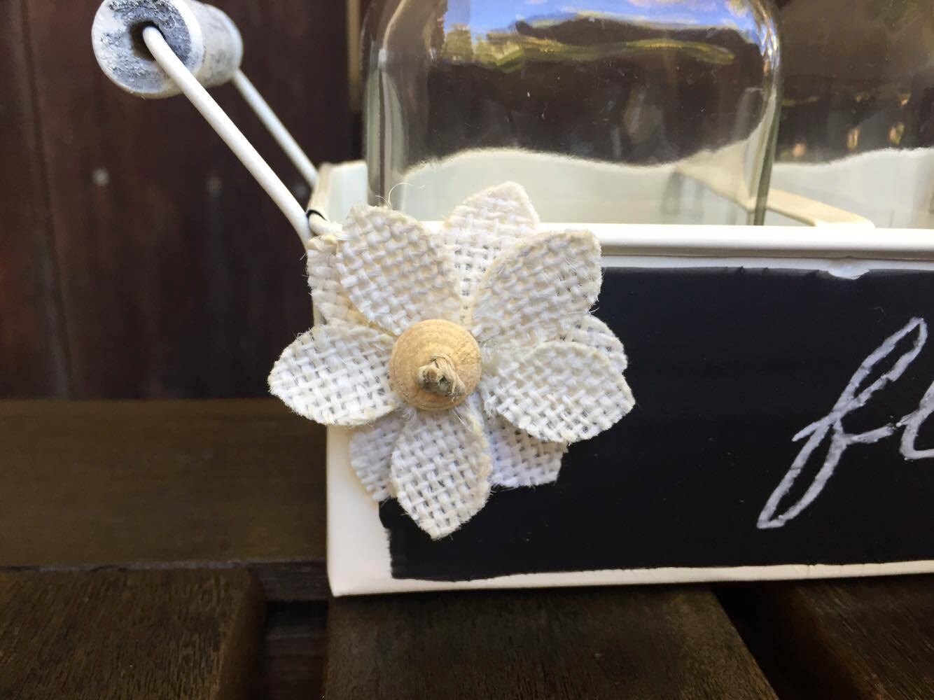 This 3 piece glass vase set sits in a creme tin holder. The front has been painted in chalkboard paint and the neck of the vases has been wrapped in twine. A burlap flower embellishment has been added to the front of the tin. The handles on the holder are wooden and have been sanded down to look more rustic.