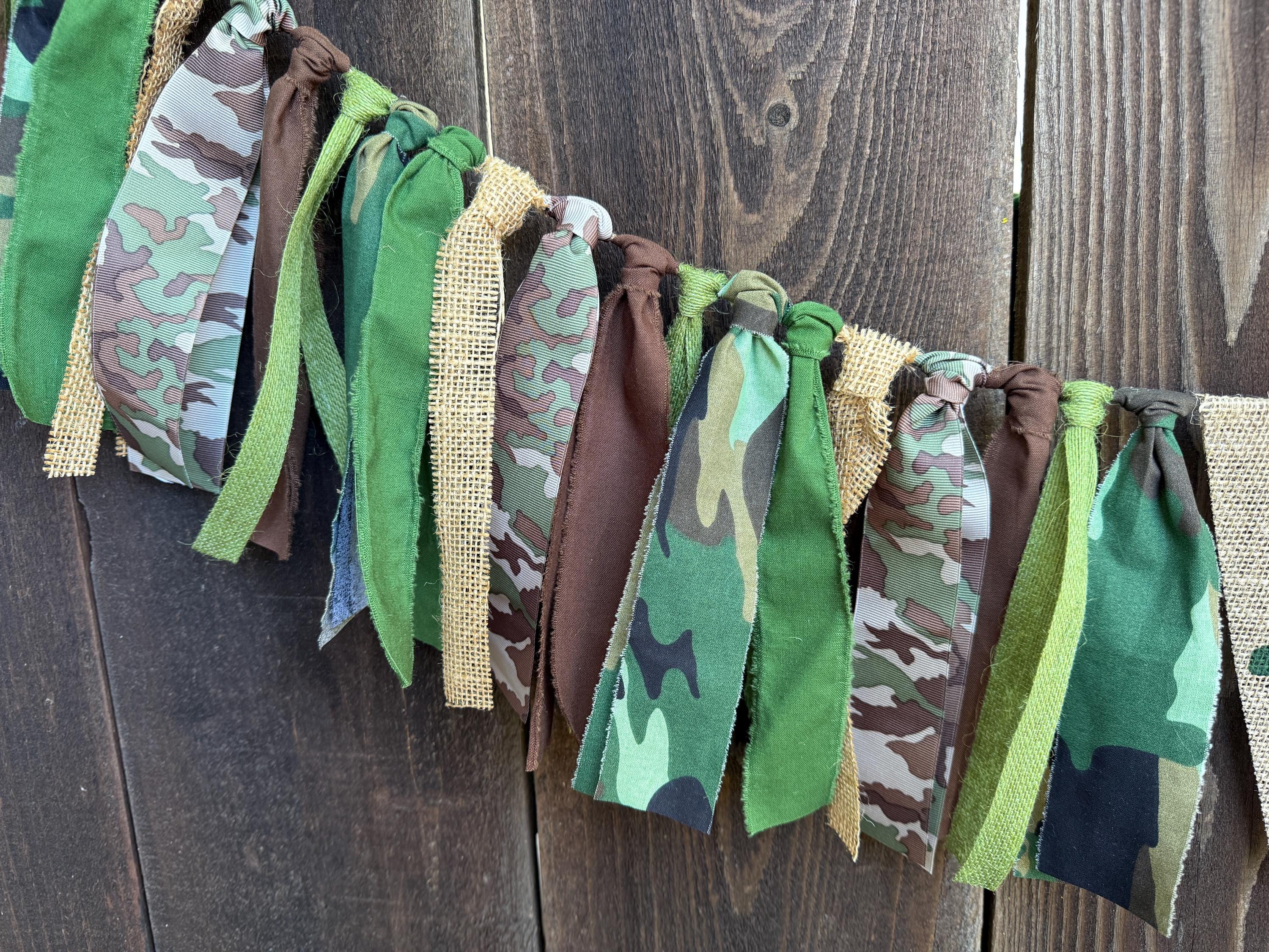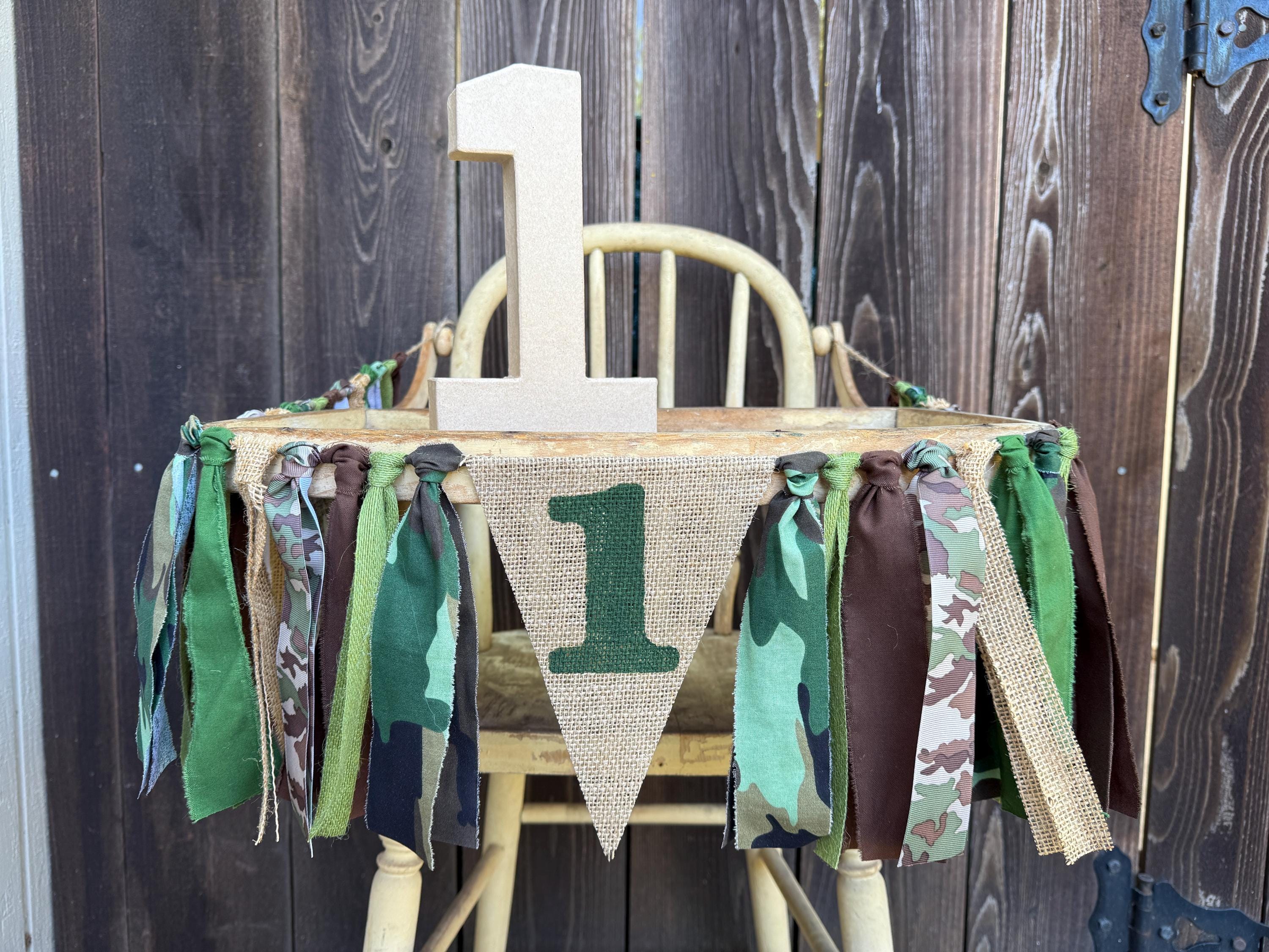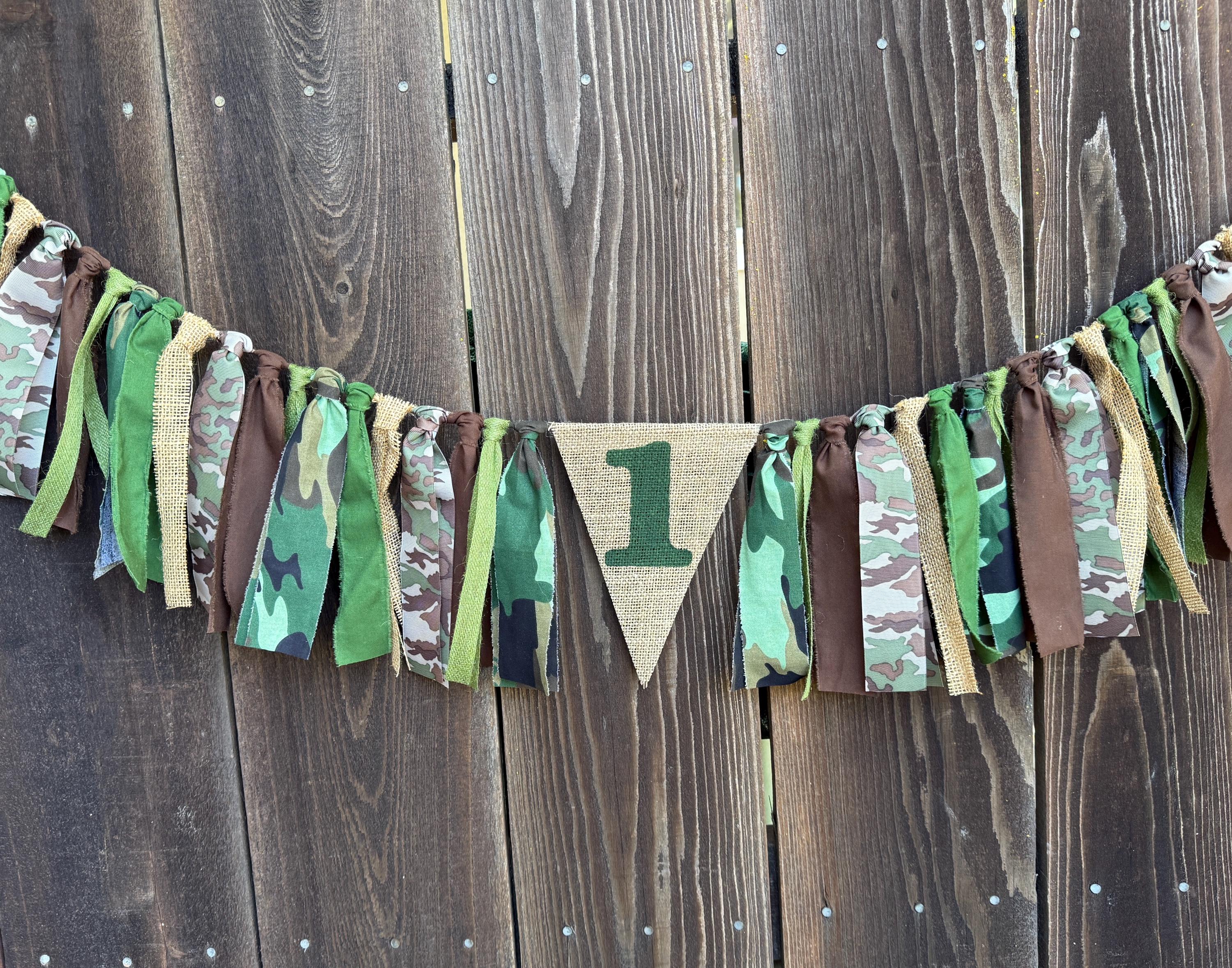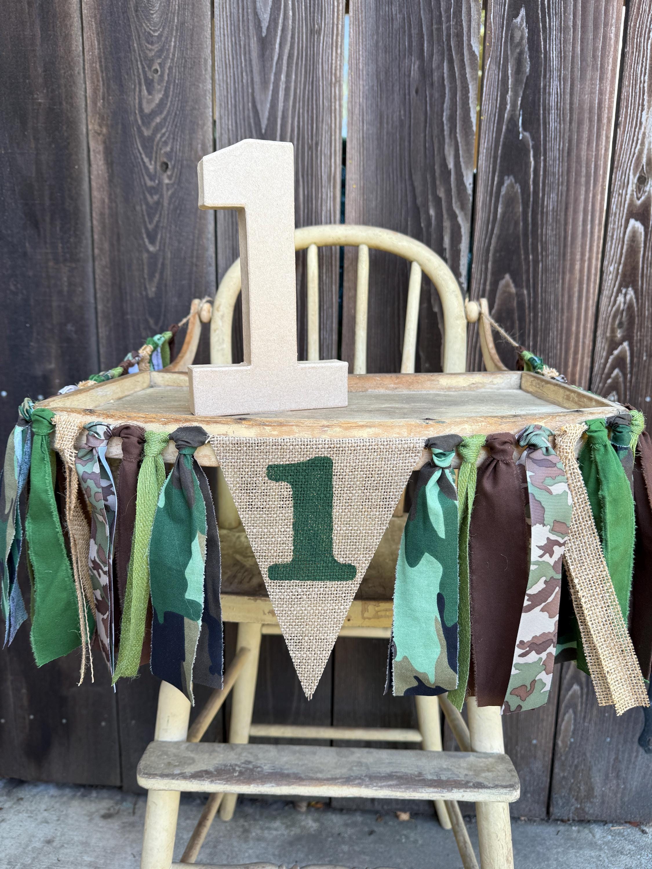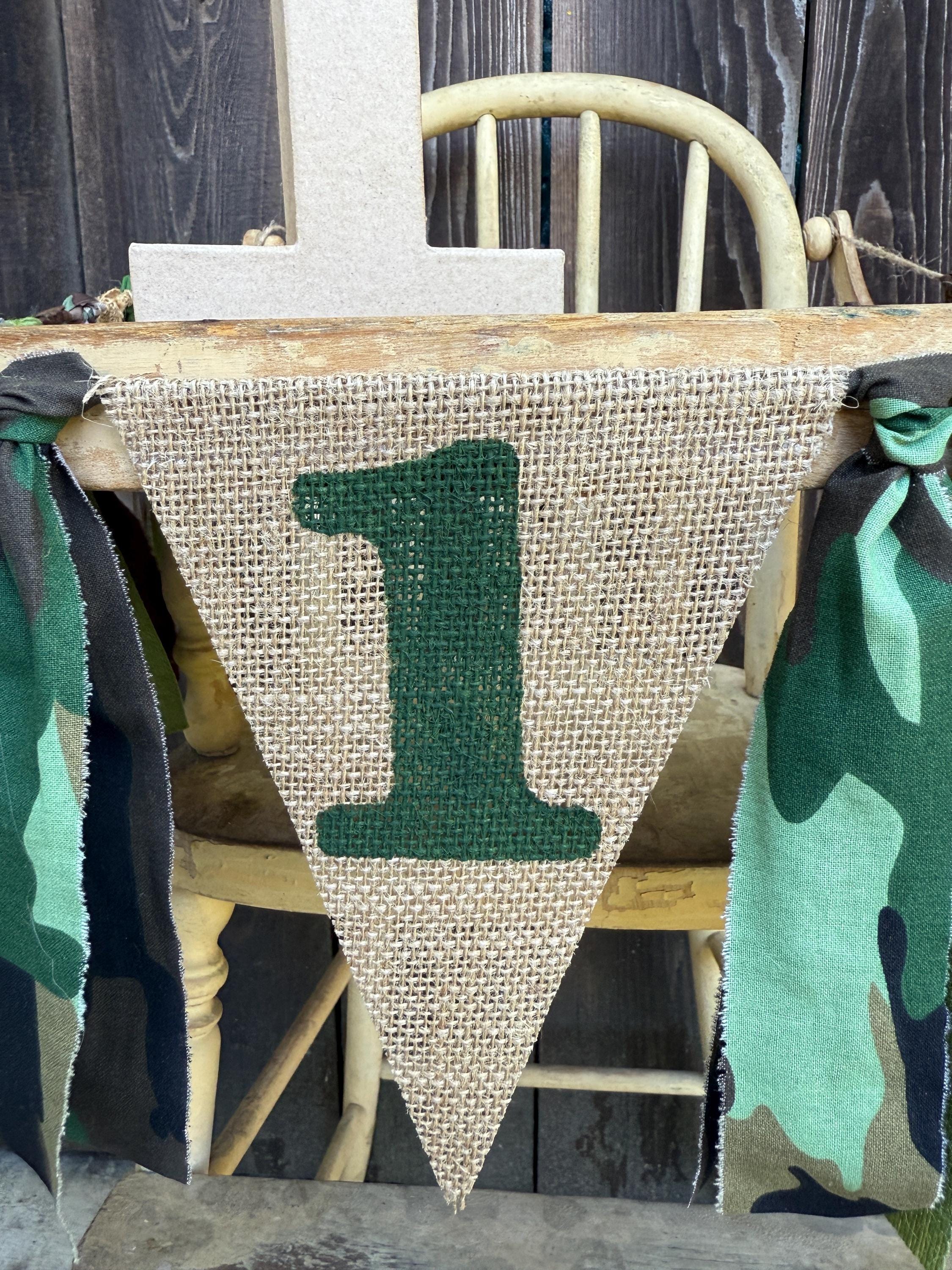 The #1 is stenciled in a dark green paint onto the burlap pennant.