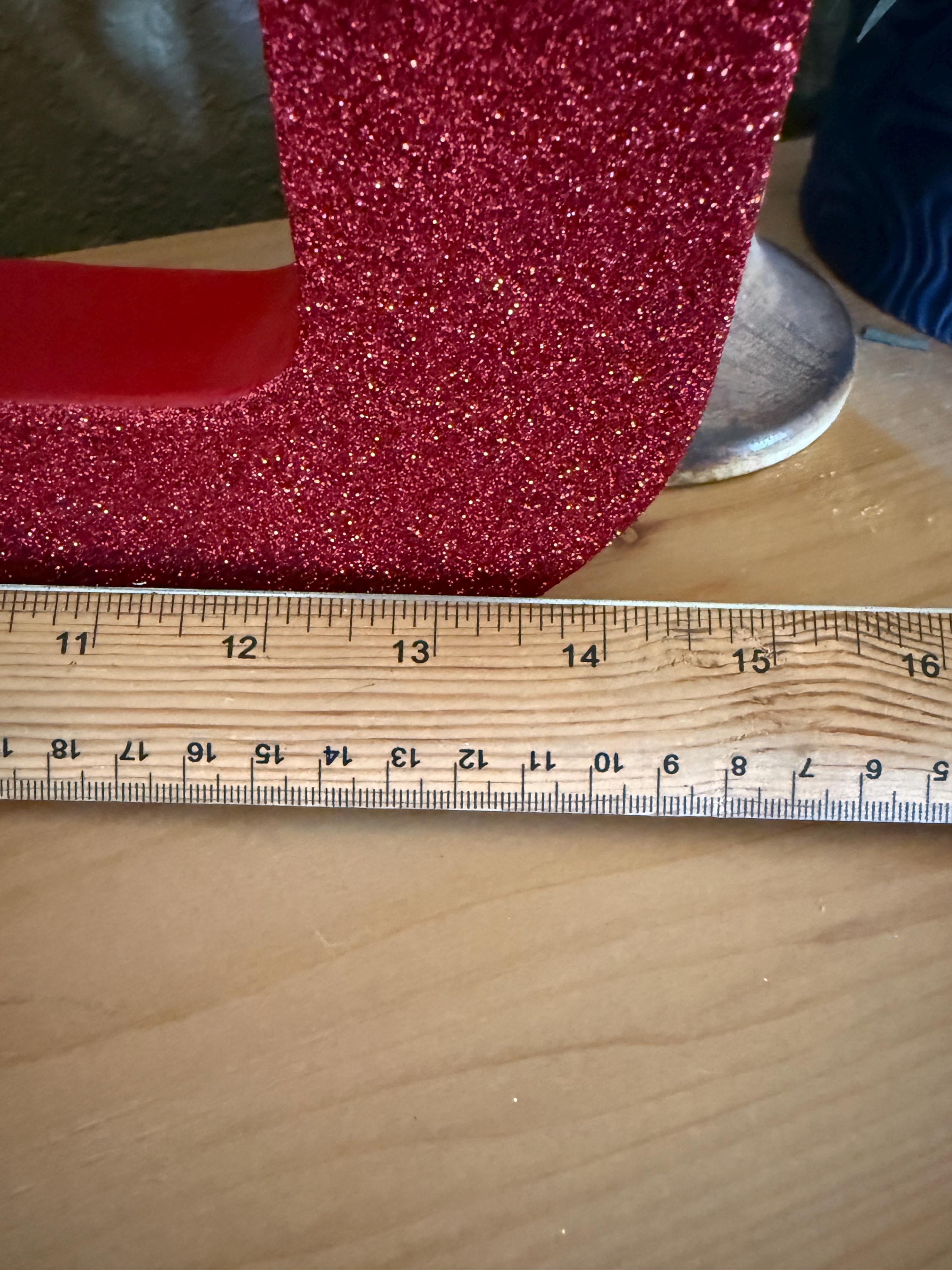 Paper mache letters are painted on front and back in red. The front is glittered with red glitter matching the paint and adhered on with Mod Podge and then the entire letter is sprayed with a clear sealer spray to minimize glitter from shedding and to protect the paint.