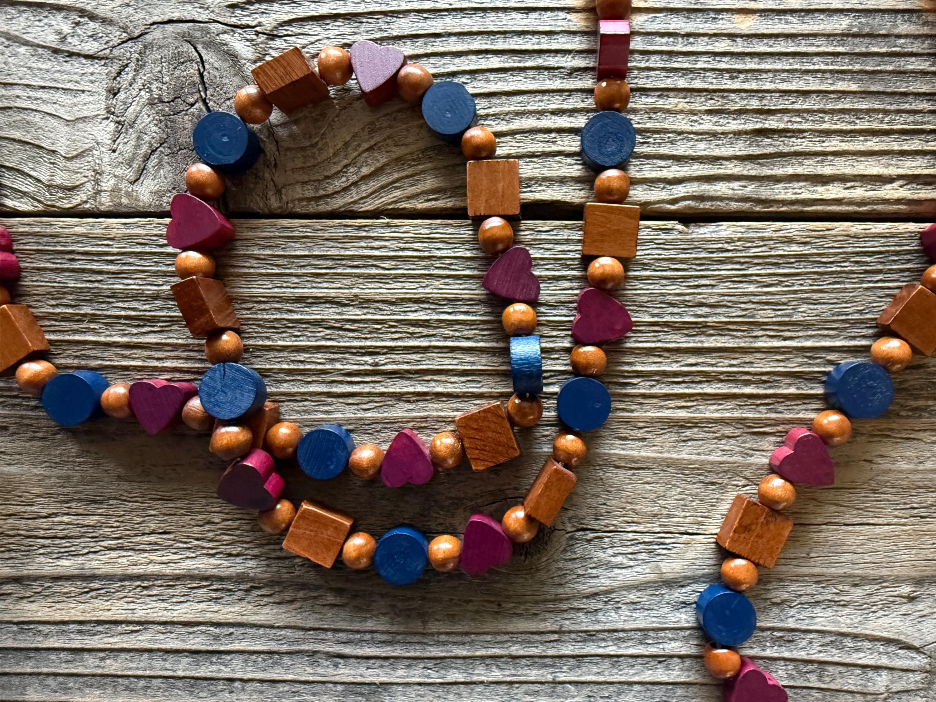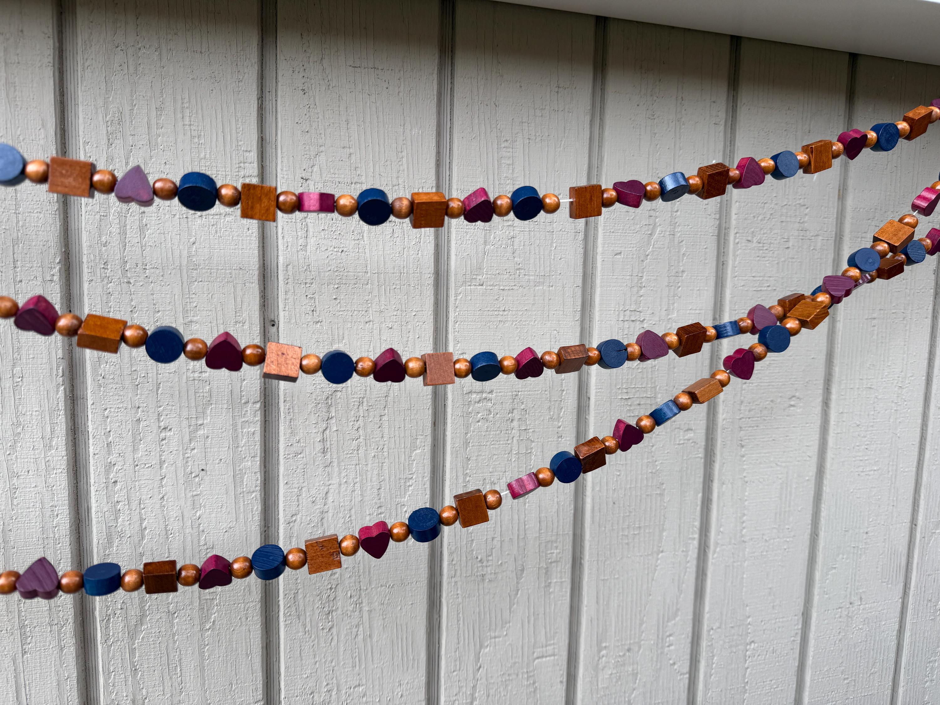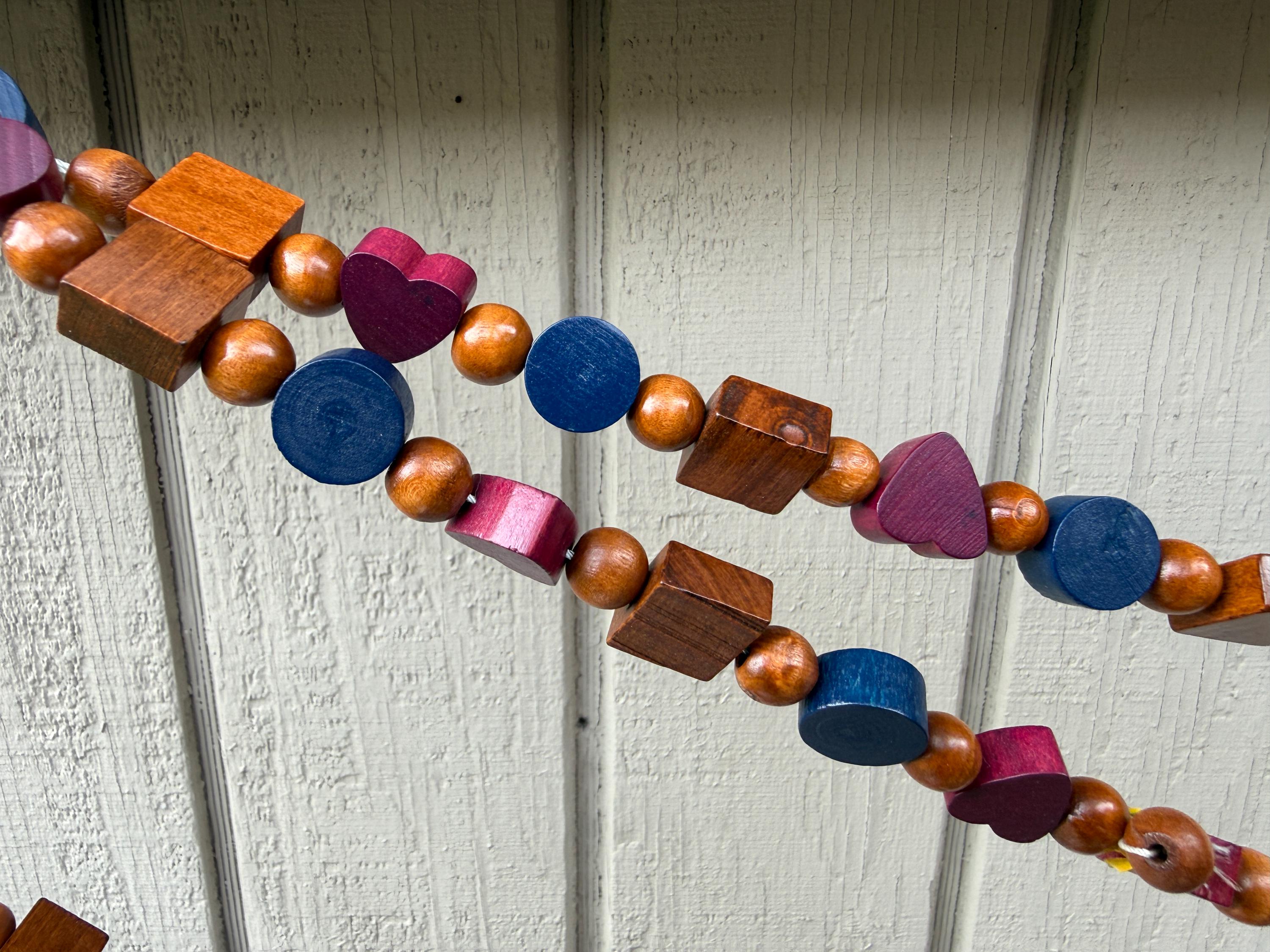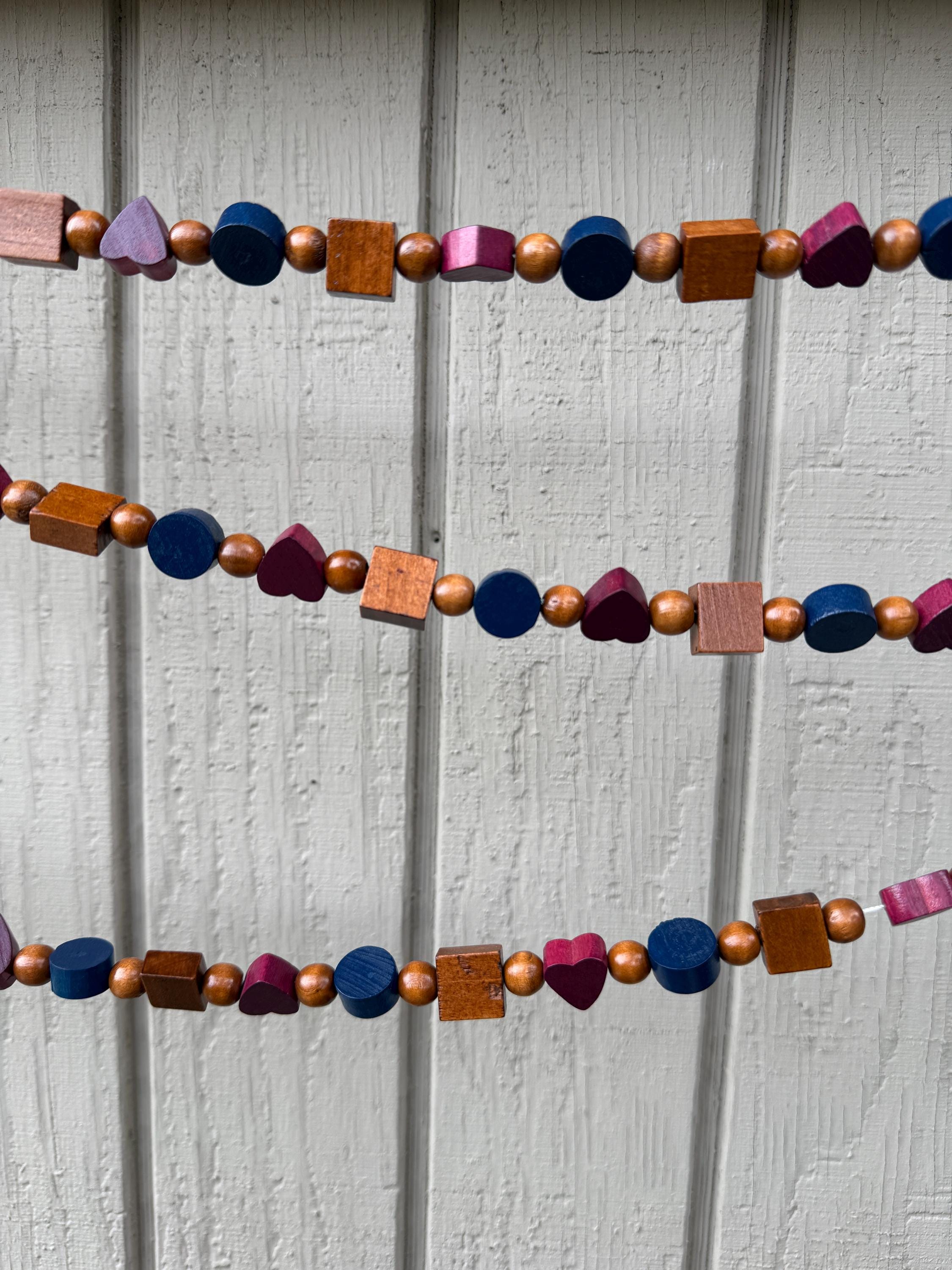 Add a pop of color and charm to your space with this handcrafted wood bead garland! Strung on durable cord and measuring approximately 9 feet long, this garland features a playful mix of multi-colored wood beads, including heart shapes, blue circle beads, and natural wood square beads for a fun, modern look.