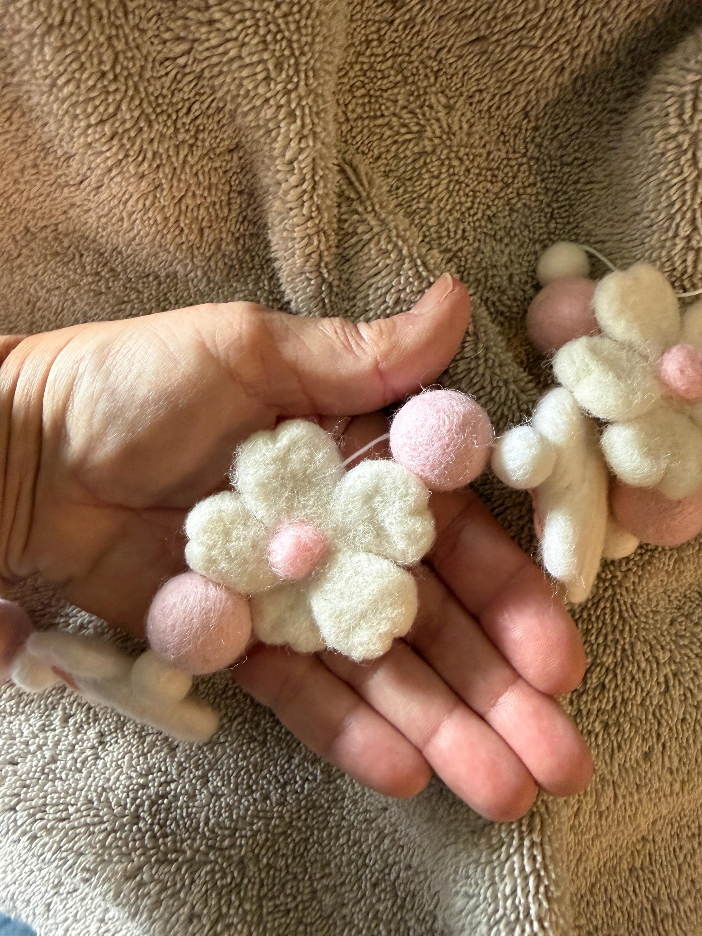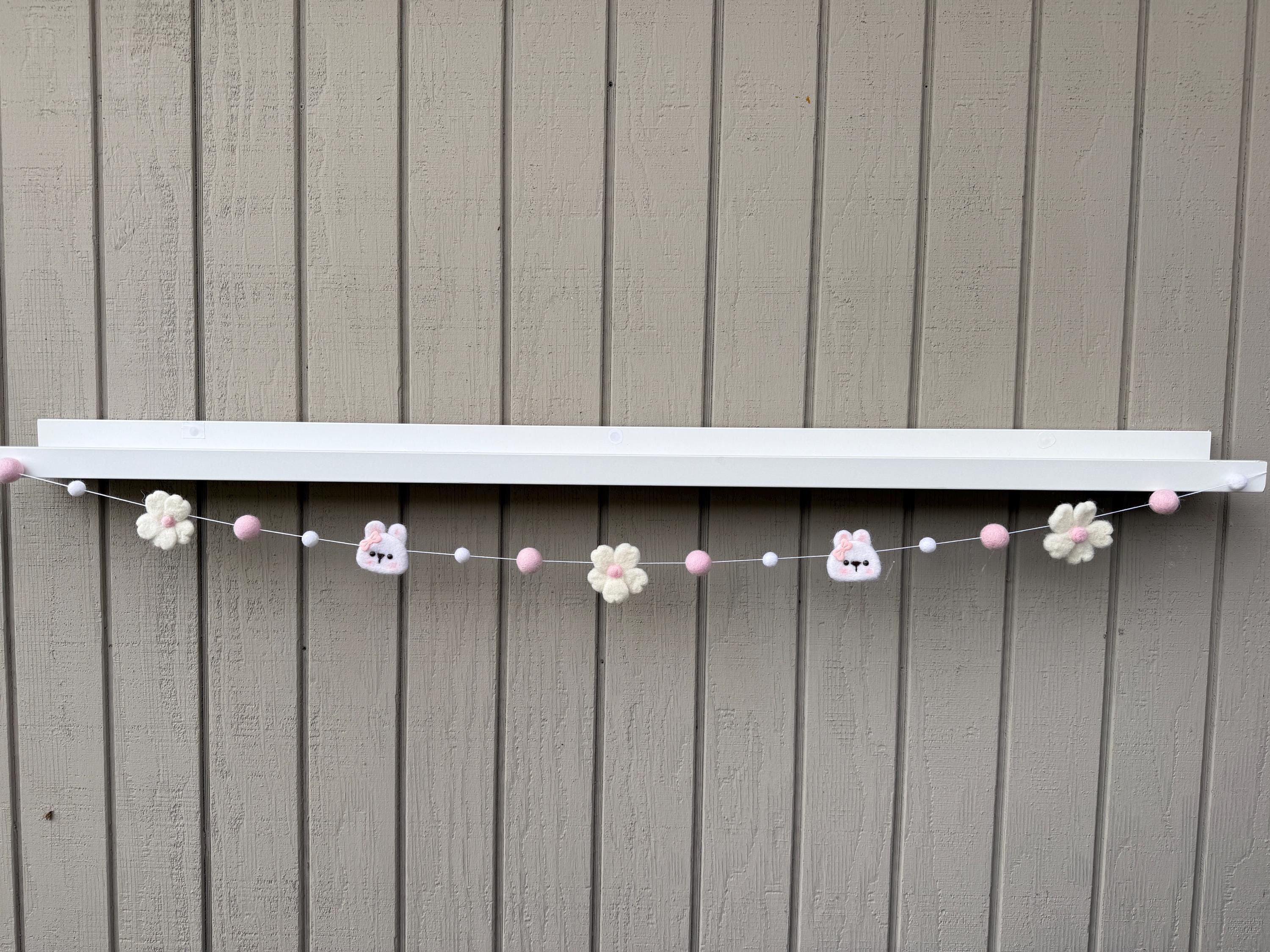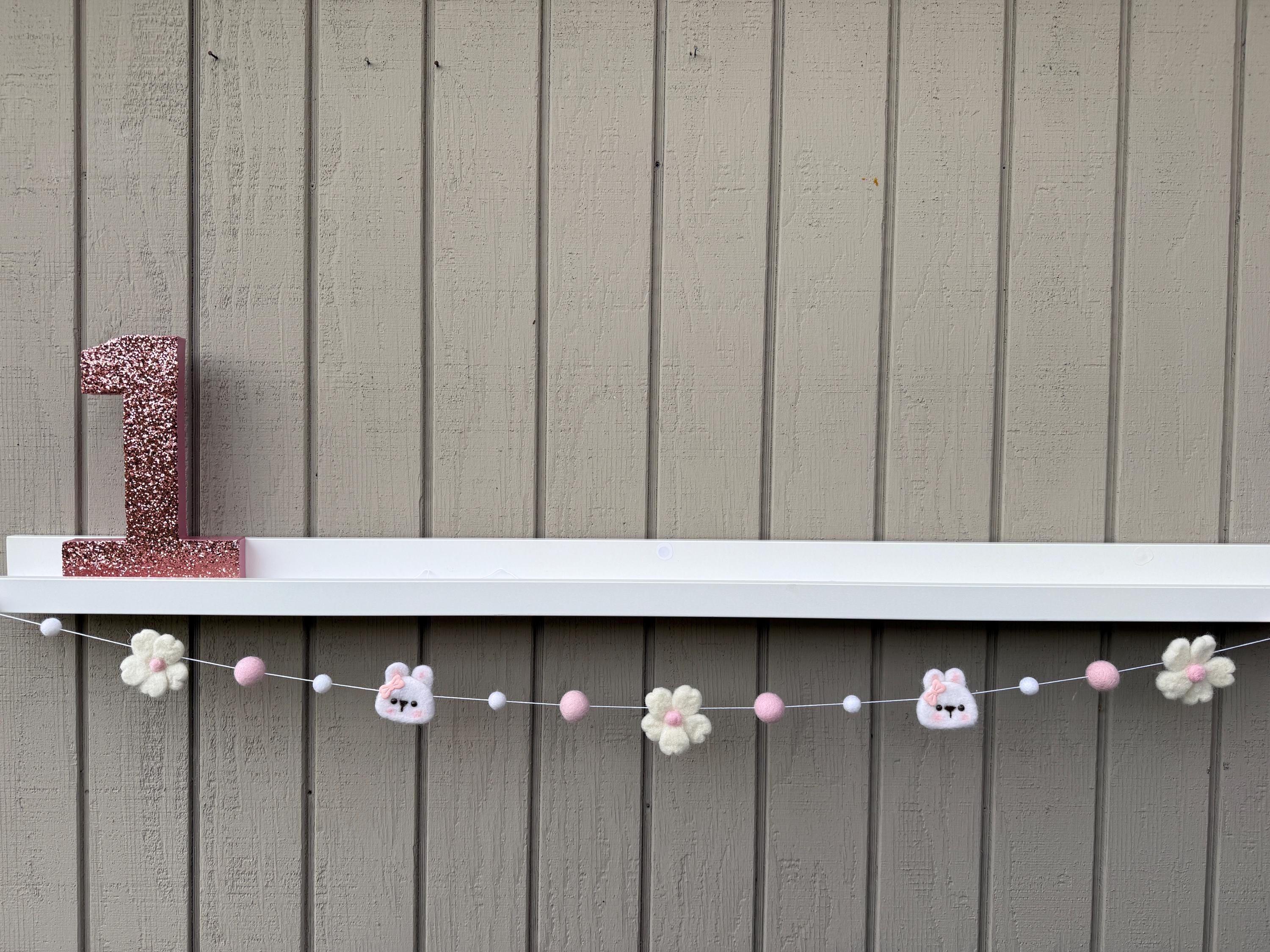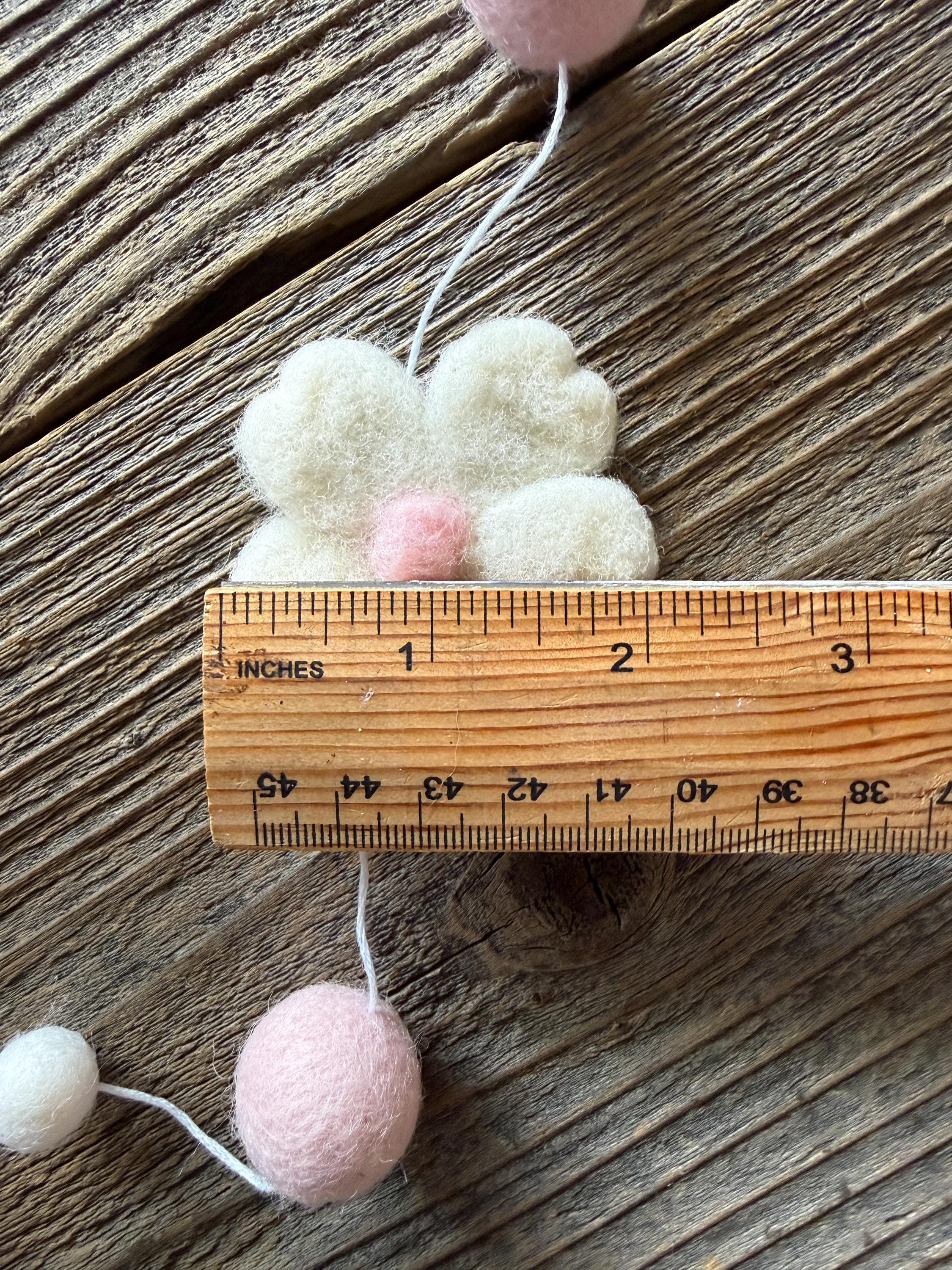 Bring instant happiness to your space with this delightful felt bunny and flower garland! Made with soft felt balls and felt bunny head and soft flowers, this garland features soft white bunny head and flower paired with white and light pink felt balls for a fun, cheerful look.