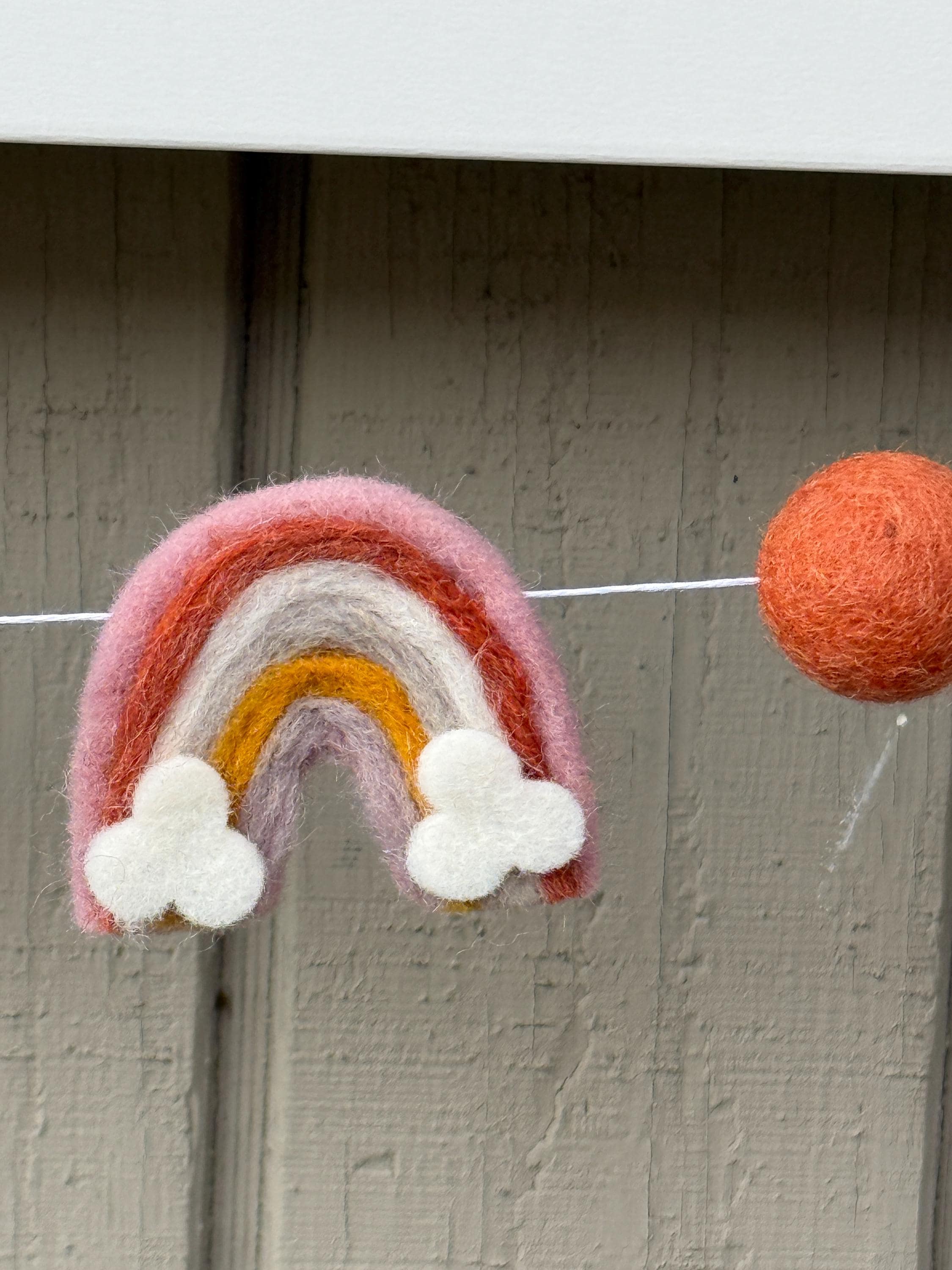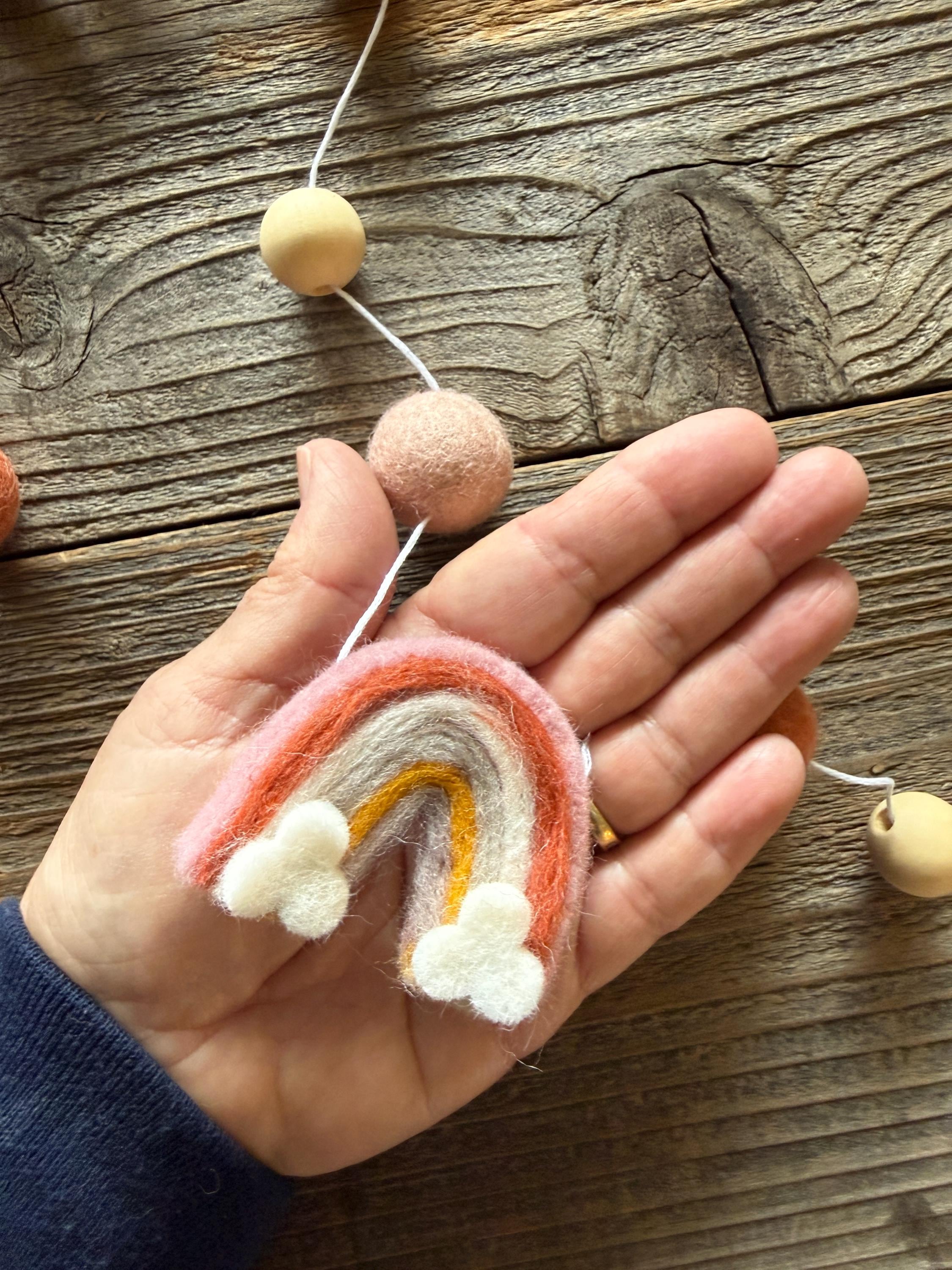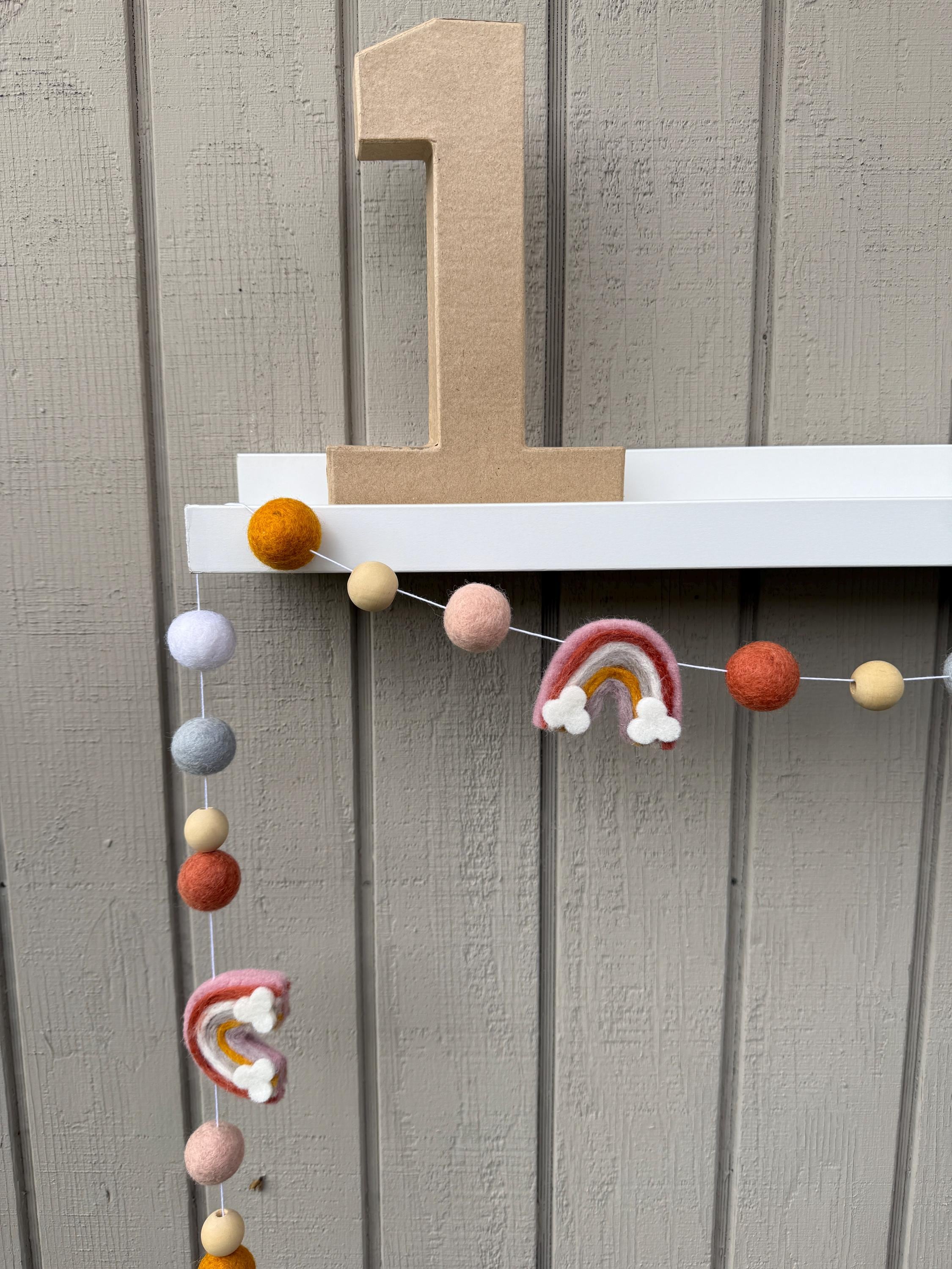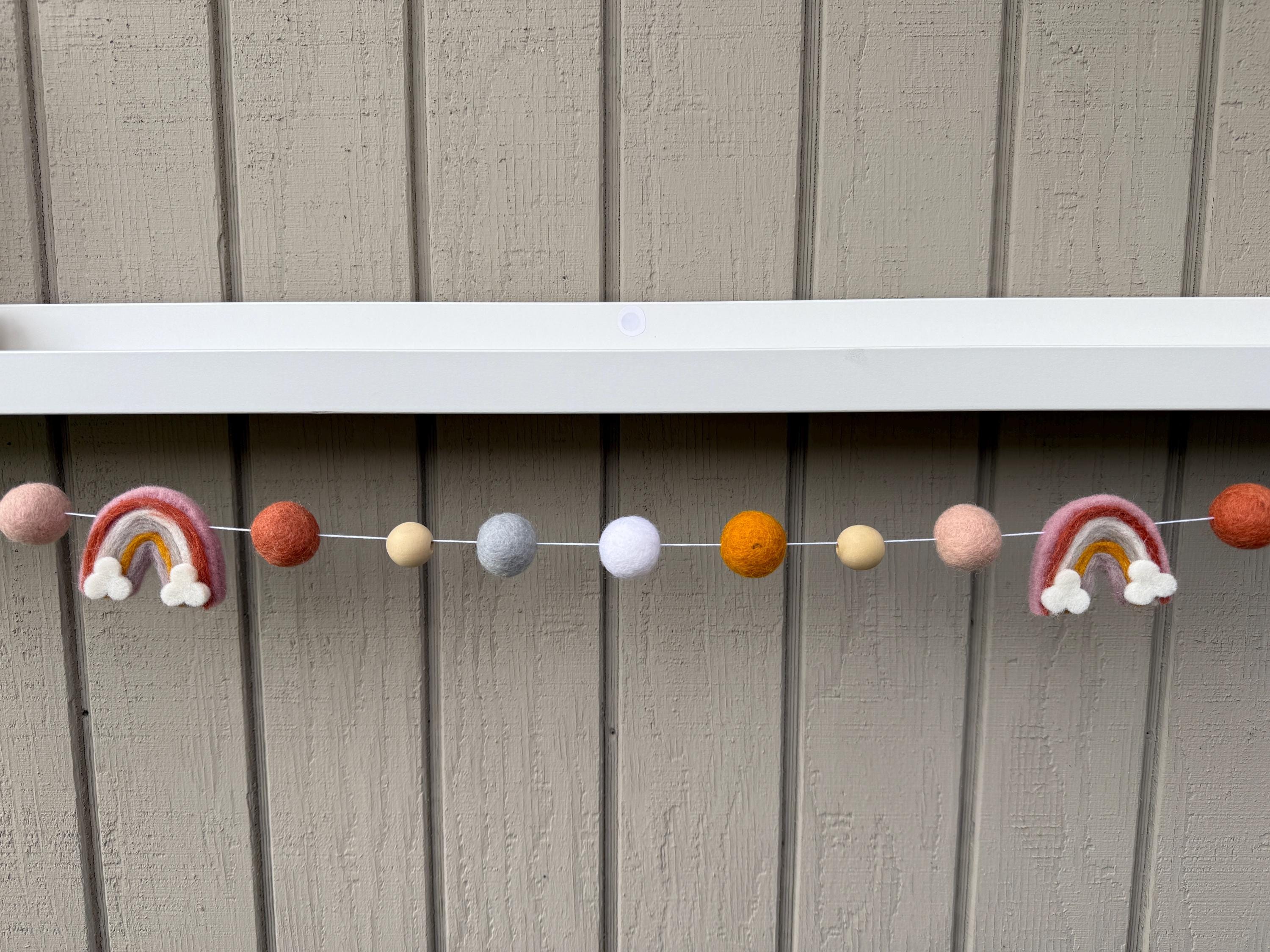 Our 4 ft felt boho garland includes 2 neutral color rainbow with clouds and 15 balls in 5 different colors; light gray, rust, mustard, white and blush. We have also added natural wood beads.