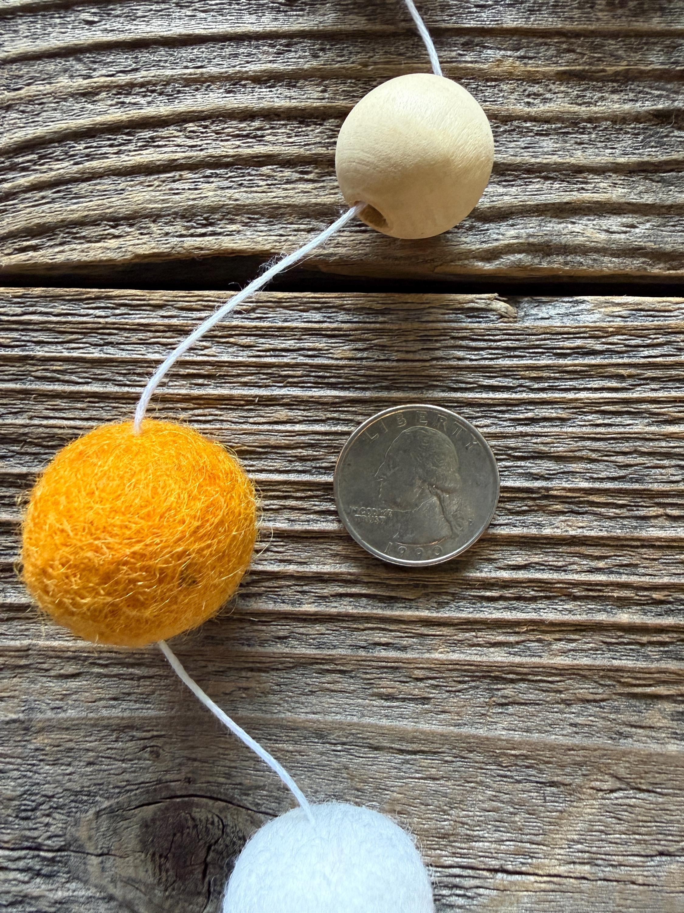 The balls and shapes are made of wool and strung on embroidery floss. They are not secured in place so you can adjust them for whatever spacing you like. Once you place them, they will not move. We spaced them out 1 1/2"-2" in the photos