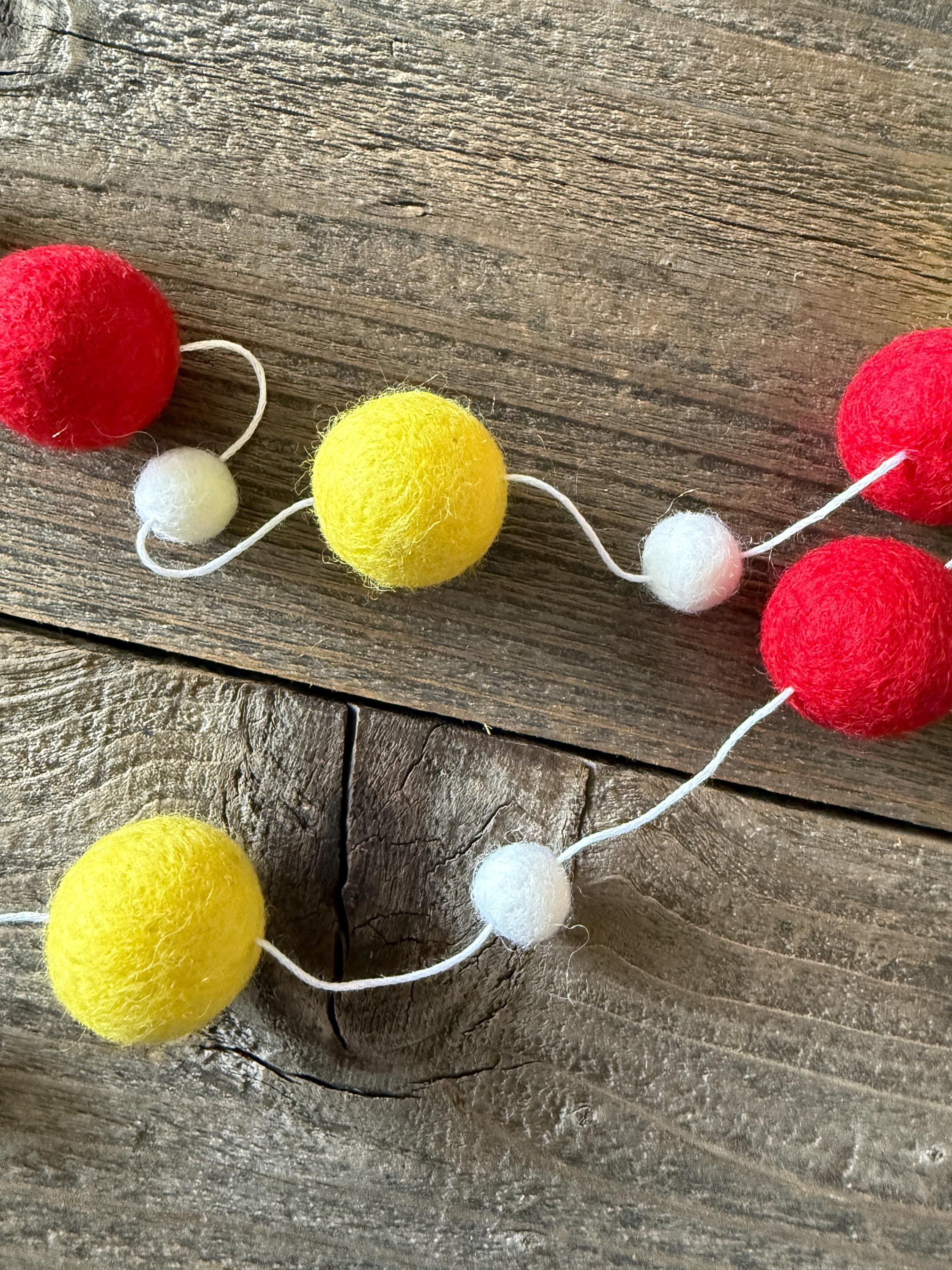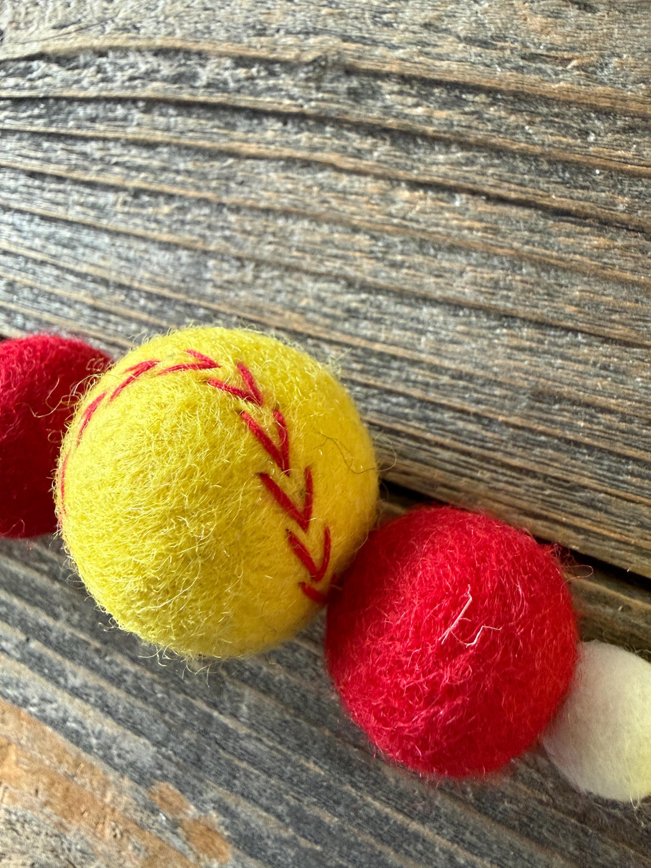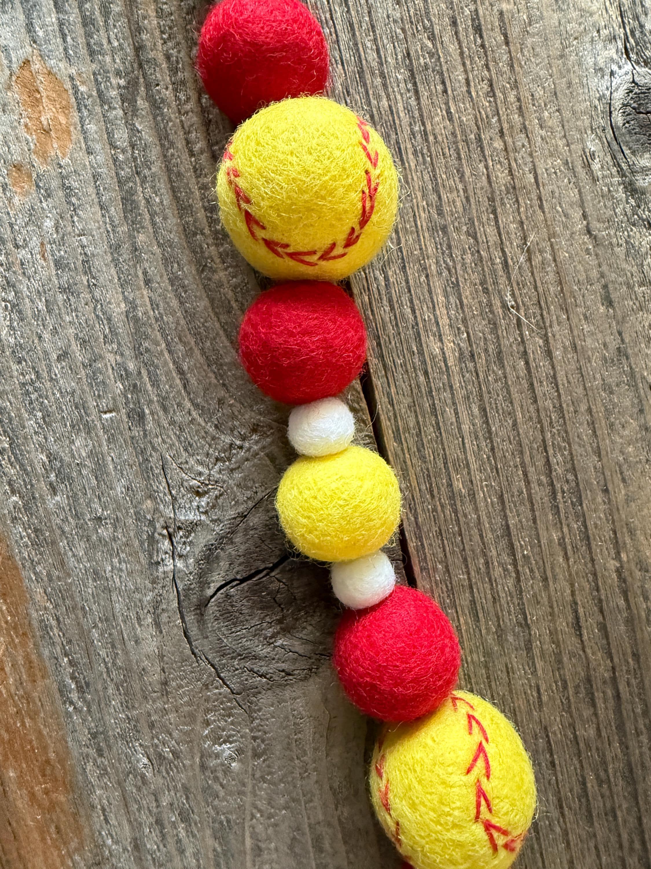 Our felt garland includes 2 or 3 felt baseballs and 16-20balls in 3 different colors; red, white and yellow.