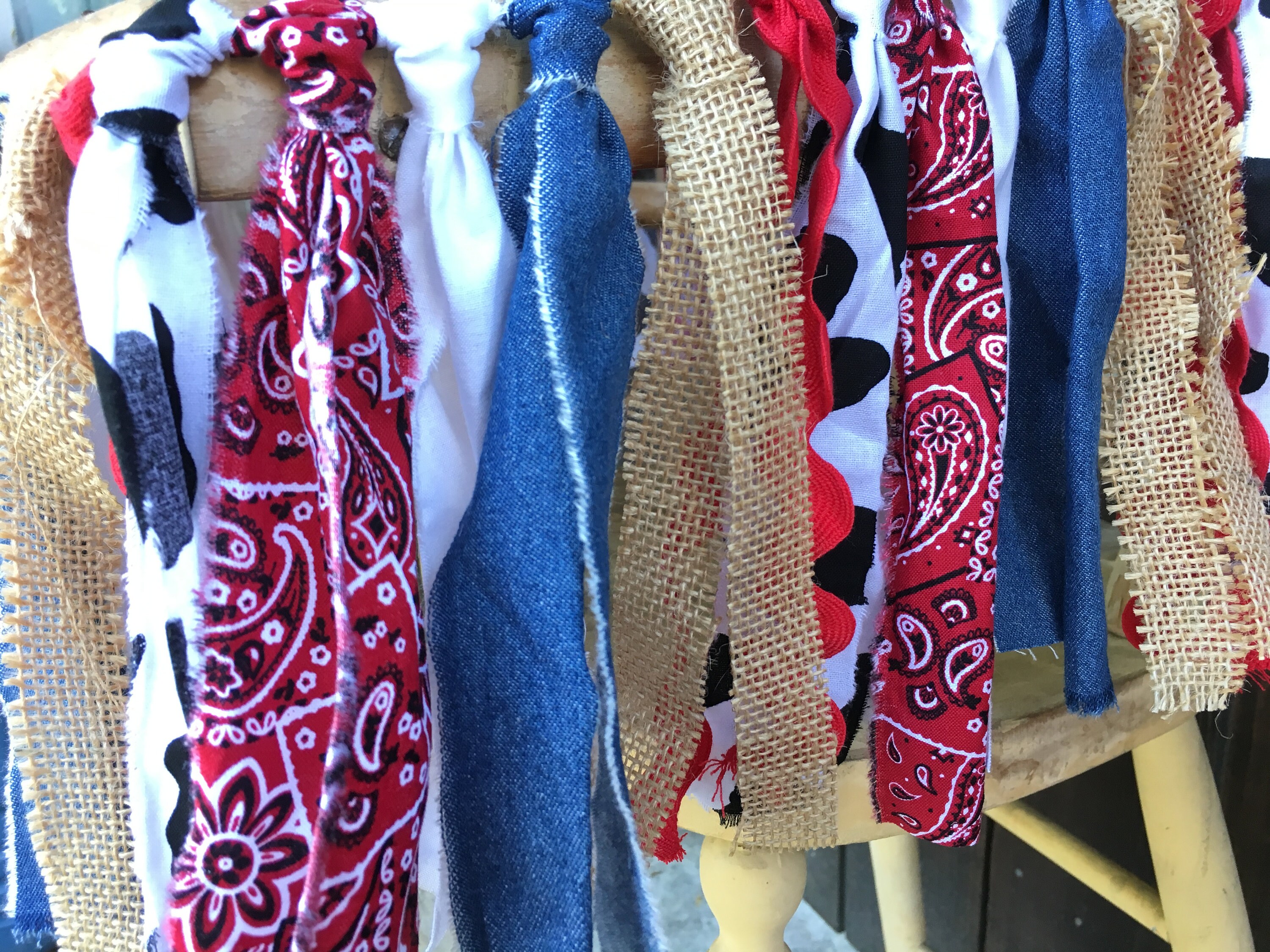 The strips of fabric vary in length but are around 8in. long. Fabrics used are cow printed fabric, jean fabric, red bandana fabric, red ric rac ribbon, burlap, red ruffle ribbon, and white cotton fabric.